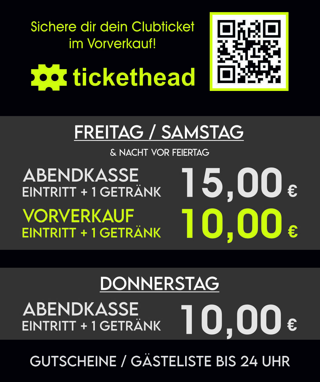 Personen auf der Gästeliste (bis Mitternacht) melden sich an der Eingangskasse. (Kein Vortritt).